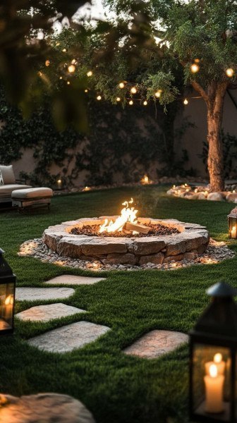 To Recreate This Look: Build a low stone wall fire pit, set stepping stones in the grass, and line the area with lanterns and soft lights.