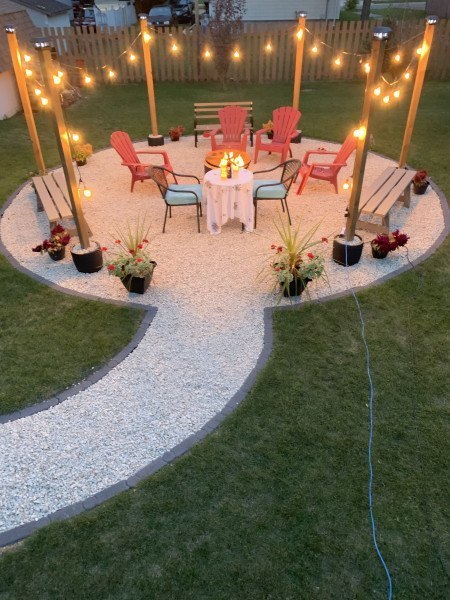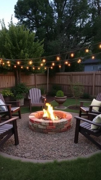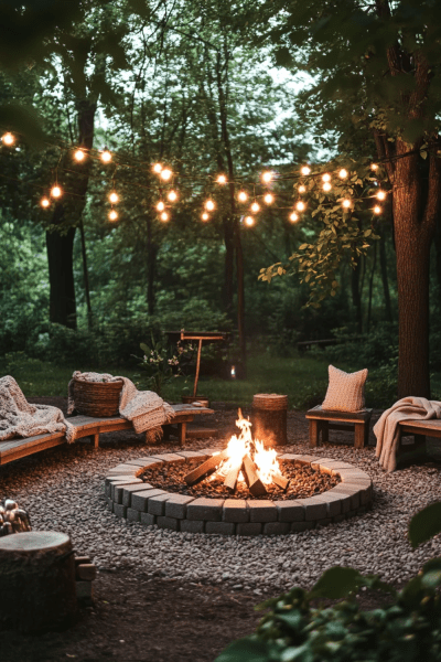If your yard backs up to trees or woods, steal this vibe. The circular backyard patio fire pit sits on gravel, surrounded by string lights and cozy low seating. Pure forest magic.