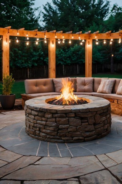 This inviting space uses a stone backyard patio fire pit as the focal point under a pergola. Paired with a sectional and string lights, it feels like an outdoor living room.