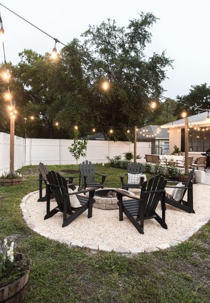 To Recreate This Look: Lay gravel in a large circular base, place Adirondack chairs evenly, and hang bistro lights above.