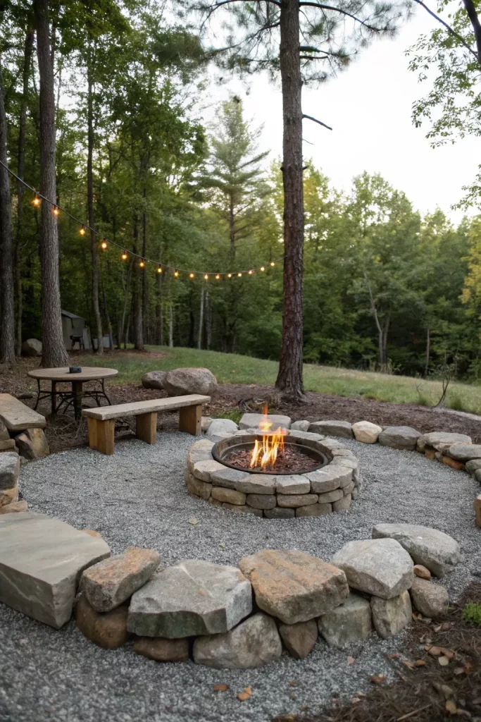 To Recreate This Look: Build a round fire pit with stacked stones, use log benches, and line the space with string lights for an evening glow.