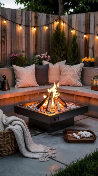 This cozy corner setup features a sleek square backyard patio fire pit surrounded by built-in seating. Neutral throw pillows, layered blankets, and string lights make it a perfect spot for s’mores or an evening drink.