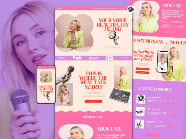Squarespace template for podcast, speakers and coaches. Give your podcast a beautiful, confident online presence with this modern, pink, feminine & bold Squarespace 7.1 website designed specifically for podcasters, creatives, and personal brands.
